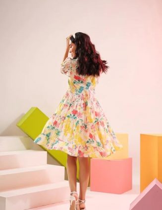 Flared A-line dress with roll tab sleeves in a stylish floral print.Versatile knee-length design perfect for beach outings, parties, or casual wear.