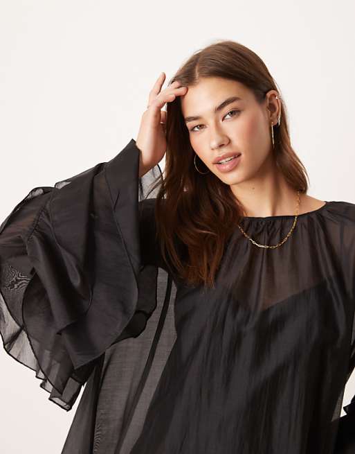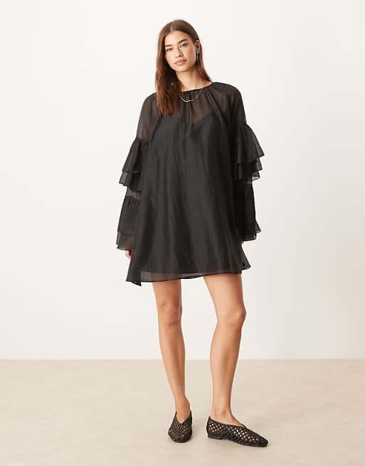 Elegant black chiffon mini dress with playful ruffle accents for a chic bohemian style.