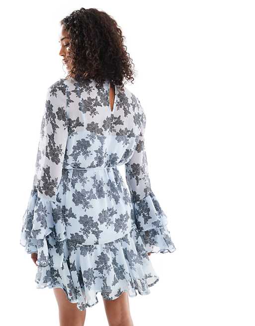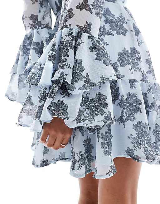 Blue Floral Boho Mini Dress with Chiffon Ruffle Sleeves