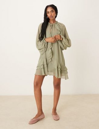 Chiffon mini dress featuring delicate ruffle sleeves and a vibrant floral print for a feminine boho look.