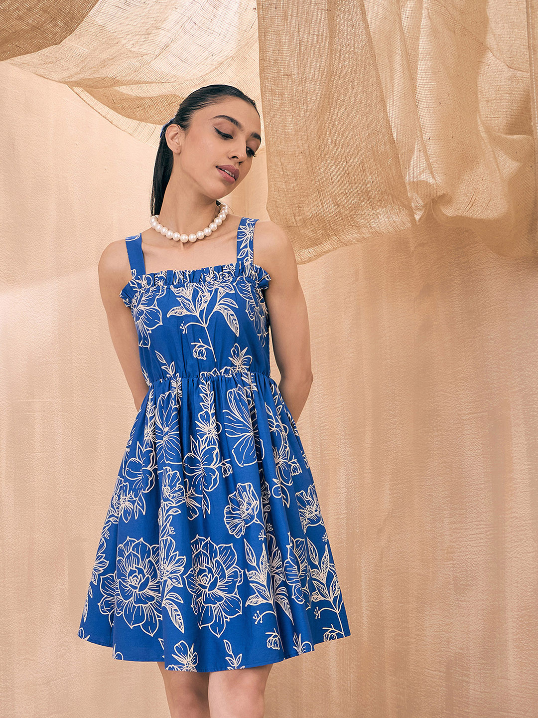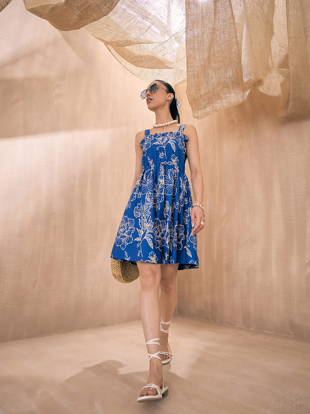 A graceful fit-and-flare dress with a flattering square neckline and floral prints.
