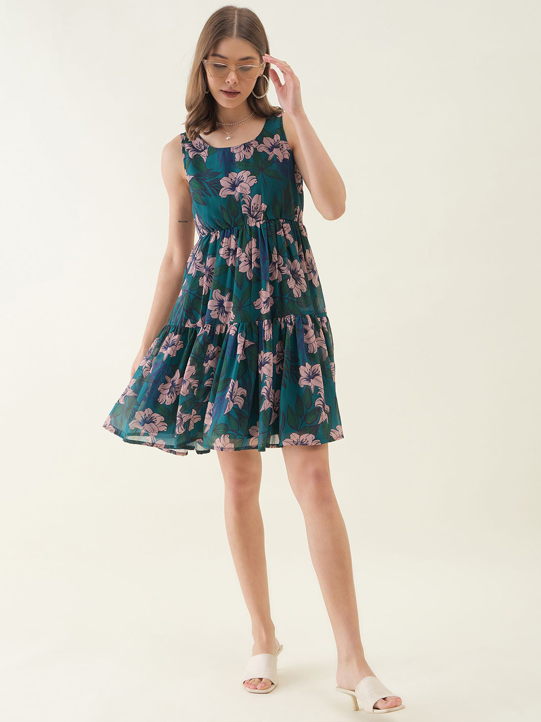 Lightweight georgette mini dress adorned with charming floral prints.