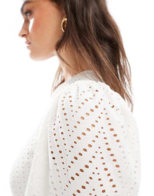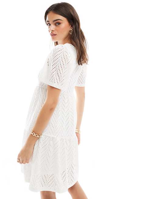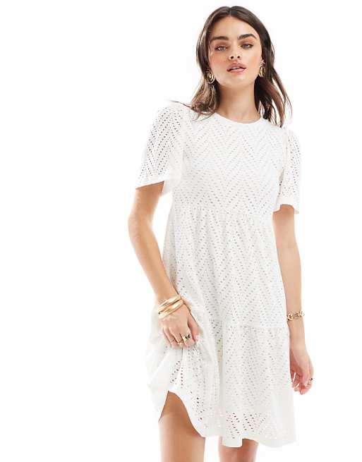 Chic white mini dress featuring delicate broderie details for a feminine touch.