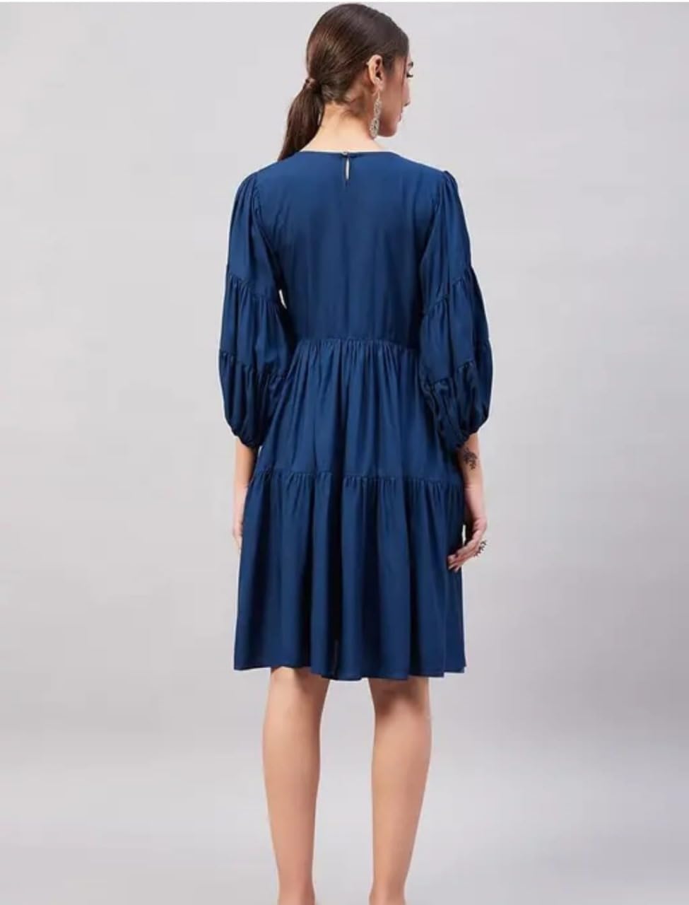 NIKLAV Women Minimalist Navy Blue Tiered Midi Dress with Puff Sleeves