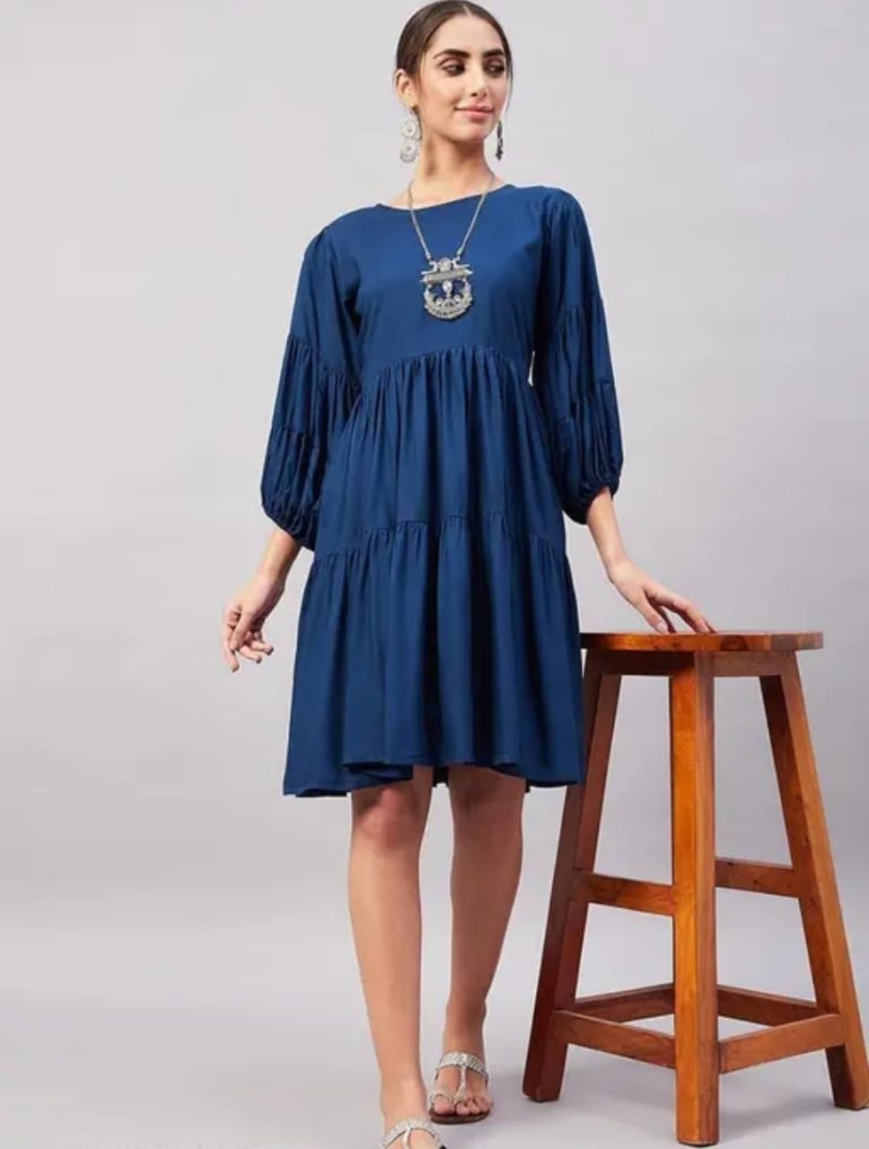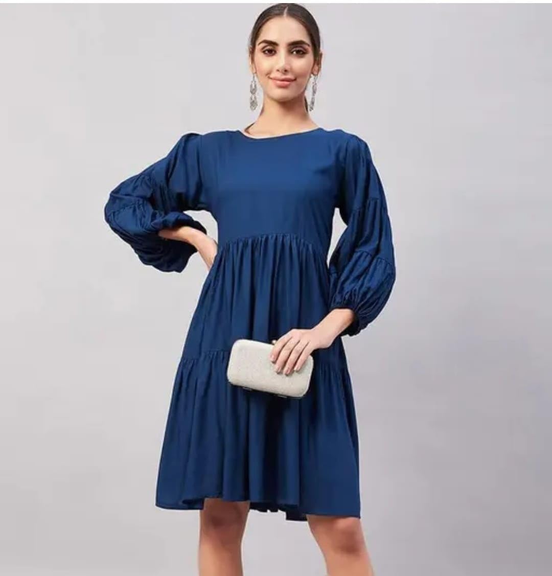 Elegant tiered midi dress in navy blue with puff sleeves for a chic, modern look.
