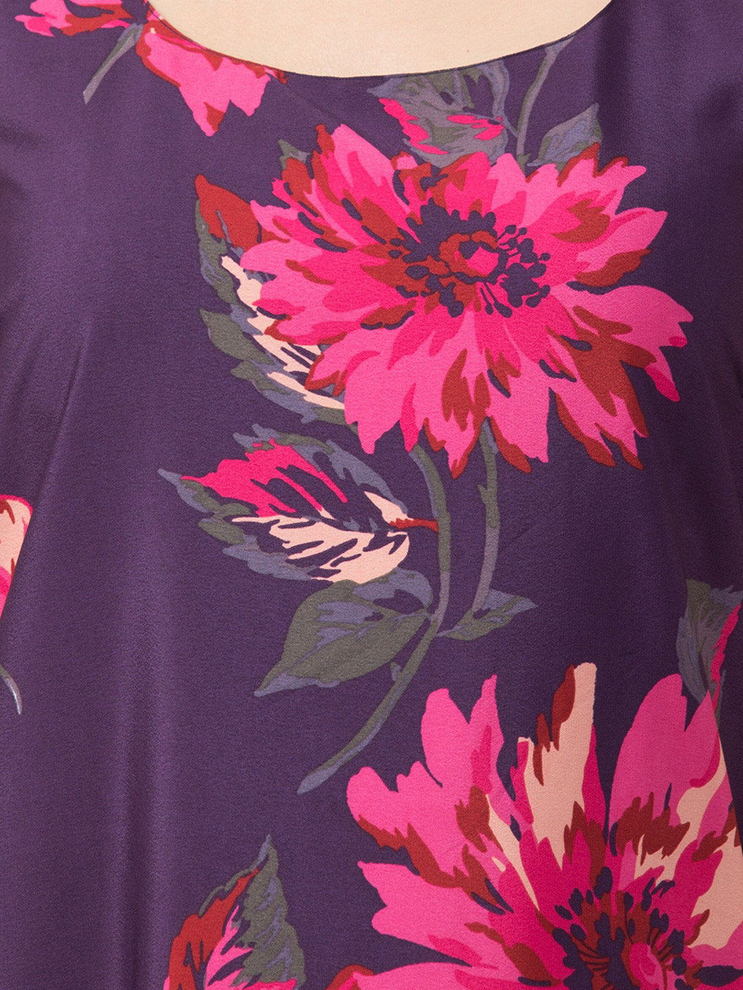 Elegant A-line dress in soft crepe fabric with a vibrant purple floral print.