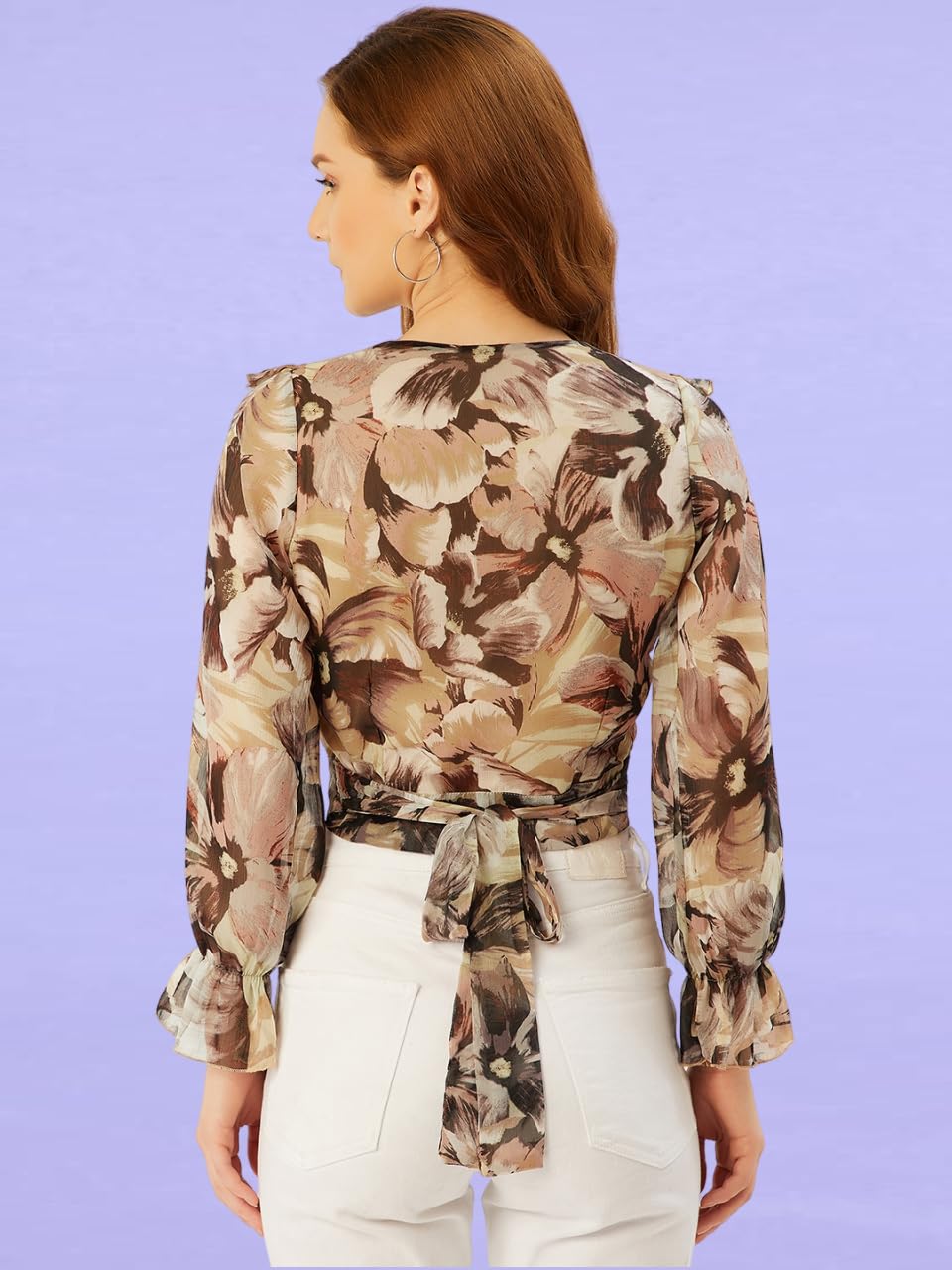 Women’s Floral Printed Brown Chiffon Wrap Crop Top with Puff Sleeves