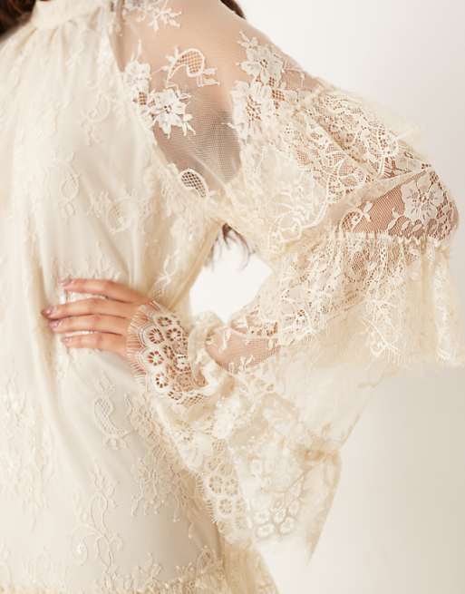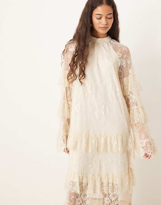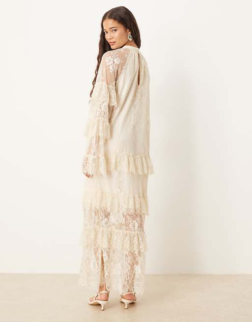 YAS Boho Sheer Lace Tiered Maxi Dress in Cream