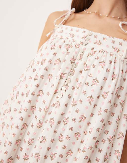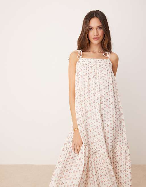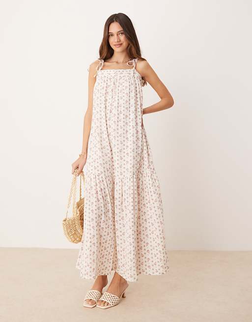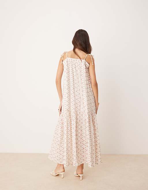 YAS Tie Shoulder Boho Smock Maxi Dress in Ditsy Pink Floral Print