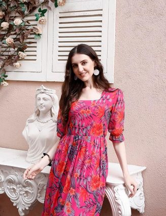 Elegant georgette dress with floral prints and half-sleeve fit & flare design.Chic A-line knee-length style perfect for casual outings or daytime wear.