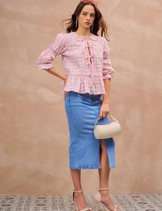 Trendy checked peplum crop top in breathable cotton for a chic streetwear vibe.Perfect for pairing with high-waist jeans or skirts for a modern urban look.